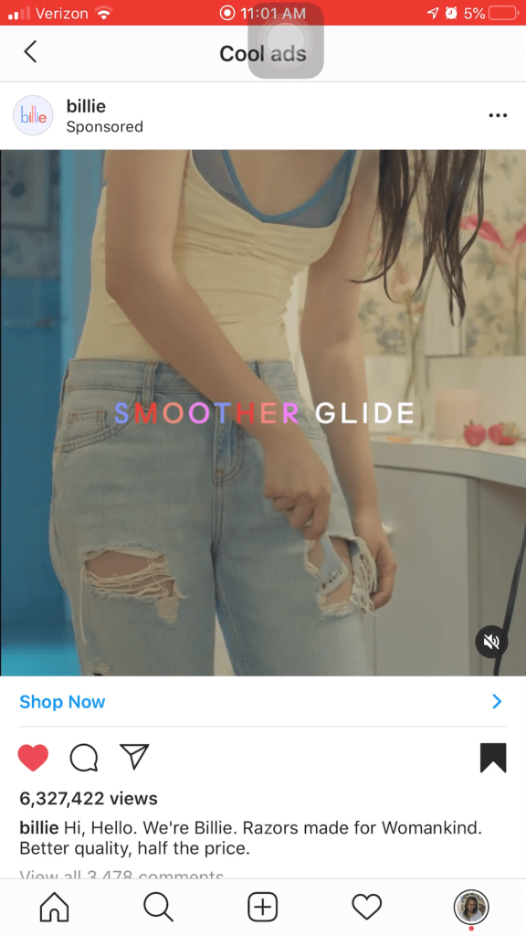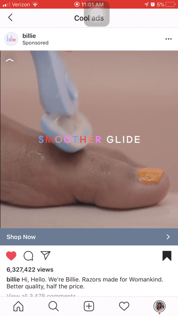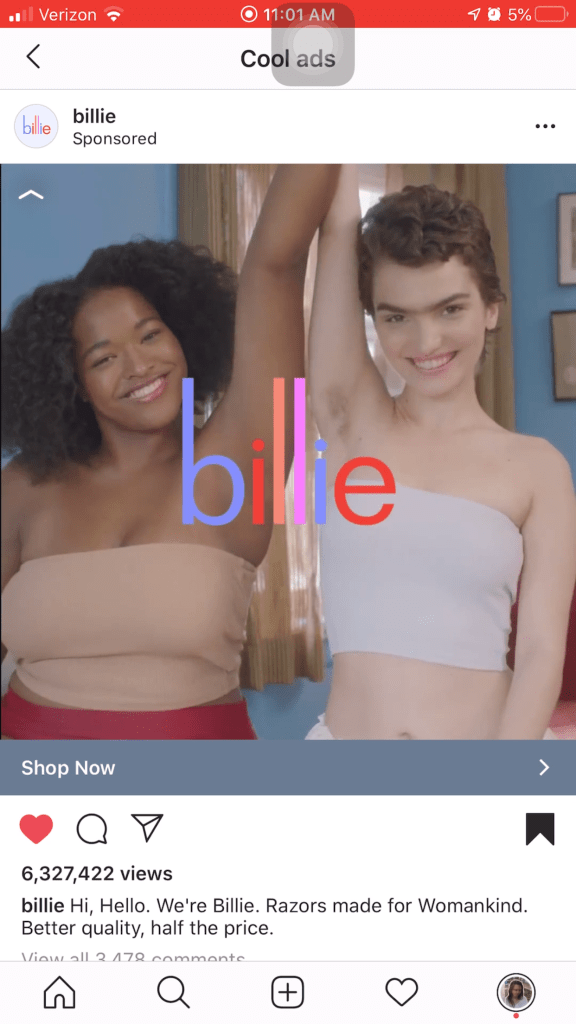 One of the ads that caught my attention was for Billie Razors. Billie is a fairly new and trendy beauty brand. Similar to other new beauty brands it offers products with a sleek, aesthetic design and promotes the company’s simplicity.