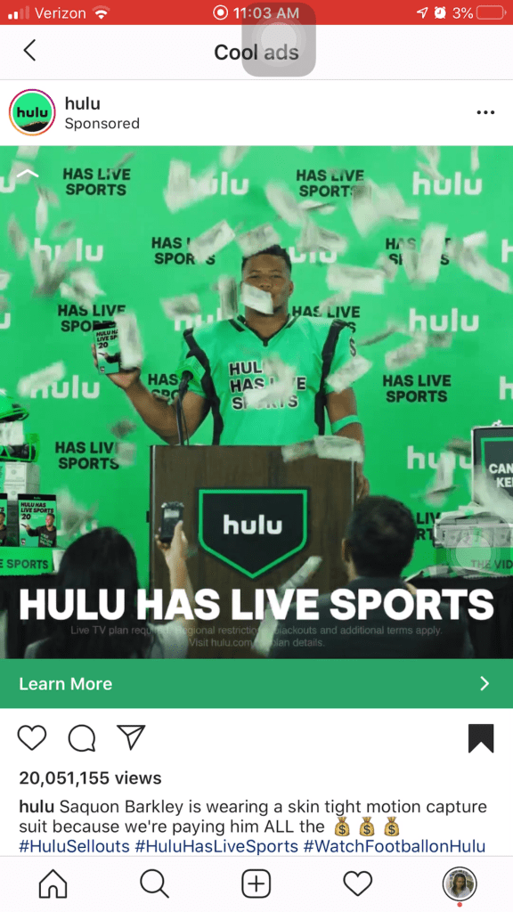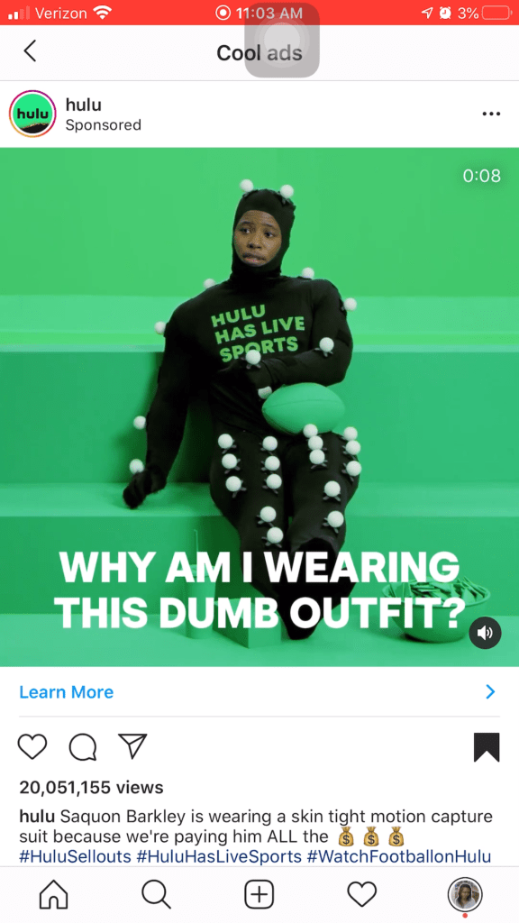 Another ad in my cool ads category is one for Hulu. A tv show and movie streaming service. This ad features football running back, Saquon Barkey, wearing a motion-capture suit.